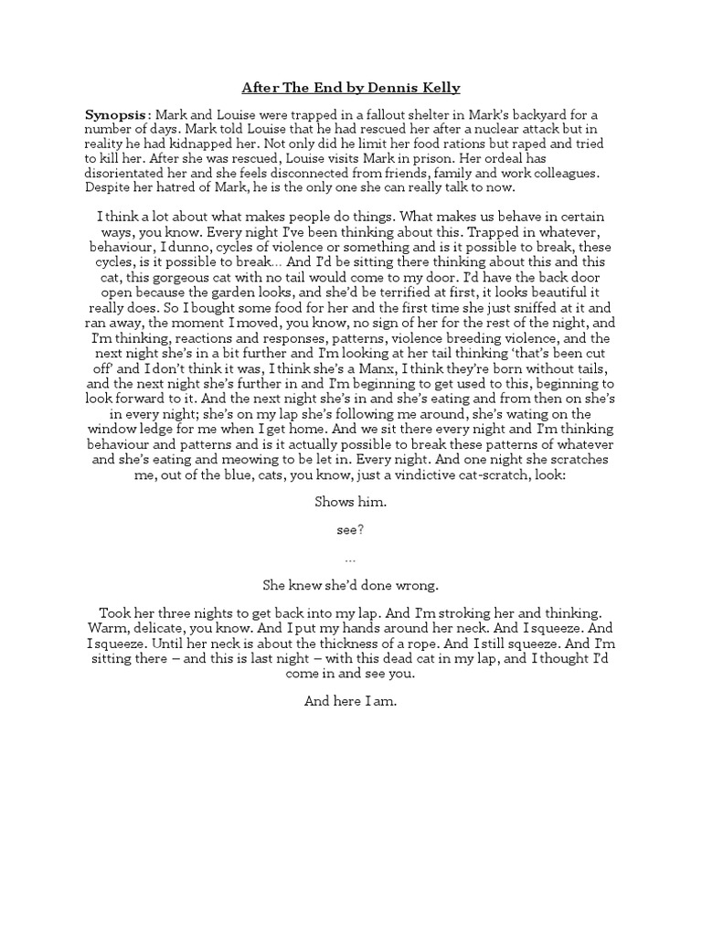 After the End. T his intense two-hander is one of Dennis Kellys earlier plays it premiered in 2005 and it hasnt aged brilliantly. Mark and Louise were trapped in a fallout shelter in Marks backyard for a number of days.
